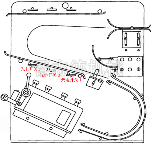 S型沖床同步整平機(jī)由整平機(jī)頭、馬達(dá)、S型送料軌道及軌道的二側(cè)的光電開關(guān)組成,其中馬達(dá)與整平機(jī)頭連接,其上帶有變頻器,整平頭包括機(jī)身、裝于機(jī)身上的導(dǎo)料架、整平調(diào)節(jié)手柄、整平輪、壓力調(diào)節(jié)螺絲和拉料輪,導(dǎo)料架裝于機(jī)身在左側(cè),整平調(diào)節(jié)手柄位于導(dǎo)料架和整平輪之間,拉料輪的上部為壓力調(diào)節(jié)螺絲。軌道架邊側(cè)有擋料輪和出料口。軌道架上還裝有控制開關(guān)。